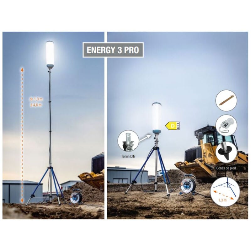 Dettagli: Proiettore LED EnergyTube XL 500 W 360° (rif. 46242): - Permette di illuminare completamente grandi superfici fino a circa 3200 m2. - Potenza luminosa: circa 70.000 lm - Temperatura di colore: 5000 K (bianco neutro) - Con slot per perno DIN per il montaggio su treppiede con perno DIN - In alternativa, può essere sospesa rapidamente con un occhiello e un moschettone - LED racchiuso in una colonna protettiva in policarbonato, ad altissima resistenza agli urti (IK10) - LED a lunghissima durata: oltre 50.000 ore (140 lm/W) - Resa cromatica: CRI > 80 - Angolo del fascio: 360 - 7 m di cavo H07RN-F 3G1,5 con guaina in gomma e spina di alimentazione con messa a terra - Con protezione termica integrata - Temperatura ambiente di funzionamento: Da -15 °C a + 40 °C - Alimentazione: 230 V / 50-60 Hz - IP44: protetto contro corpi estranei e spruzzi d'acqua Treppiede professionale XXL con traversa (cod. 46758): - Supporto in acciaio tubolare verniciato a polvere con 5 elementi tubolari