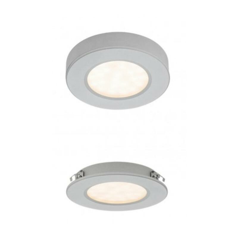 Incasso fisso equipaggiato con LED SMD, montaggio ad incasso o da superficie, struttura in alluminio verniciata argento, diffusore in PMMA satinato, driver incluso.
