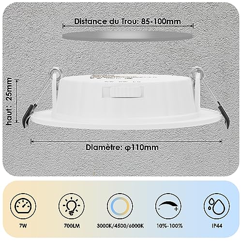 Faretto LED da incasso dimmerabile, faretto da bagno 7W,faretto LED extra piatto 25mm,IP44 impermeabile faretto foro Φ85-100mm,3000K 4000K 6500K illuminazione a soffitto 230V per soggiorno,cucina