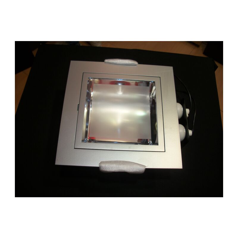 FARETTO DA INCASSO A SOFFITTO PER INTERNI,QUADRATO CON VETRO E FINITURA IN METALLO COLOR ACCIAIO INOX. IL FORO PER L'INCASSO E' DI 205mm. IL FARETTO MONTA 2 LAMPADE DA 26W CADAUNA.