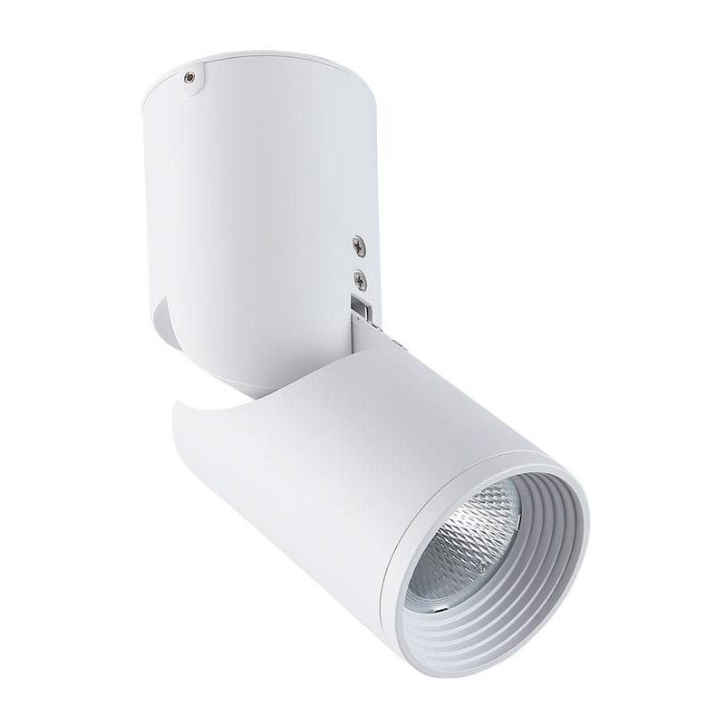Faretto LED inclinabile da superficie, dal design moderno e funzionale, facilmente integrabile in qualsiasi progetto illuminotecnico che richieda una luce d'accento o di evidenziazione. Può essere orientato fino a 90° e ha un angolo di apertura del fascio luminoso di 24°. Incorpora un apparecchio LED COB ad alta capacità con un chip CREE di alta qualità che emette una luce bianca calda (2700K), con una potenza di 15W e una luminosità di 1100 lumen. L'elevato indice di resa cromatica, CRI>95, consente di visualizzare i colori in modo realistico, senza distorsioni. Realizzato in alluminio laccato con finitura opaca, è disponibile in bianco e nero.