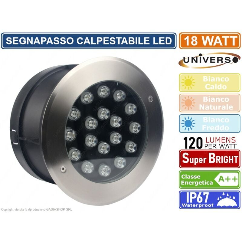 Faretto LED Segnapasso. Installazione a interramento e potenza di 18W. Forma circolare con controcassa in plastica nera, corona in acciaio effetto spazzolato e vetro trasparente. POWER LED SMD con fascio luminoso di 30° e flusso luminoso di 2200 lm. Connessione molto semplice grazie al driver integrato e tramite i cavi a saldare. Ideale per l'illuminazione di piante e cortili e, grazie al grado di protezione IP65, è adatto a resistere per molto tempo interrato ed esposto alle intemperie. Disponibile con due differenti temperature di colore: Luce Bianca Calda 3000K, Luce Bianca naturale 4000K e Luce Bianca Fredda 6500K . Dimensioni: Ø 200 x 90 mm. Foro Incasso: Ø 185mm