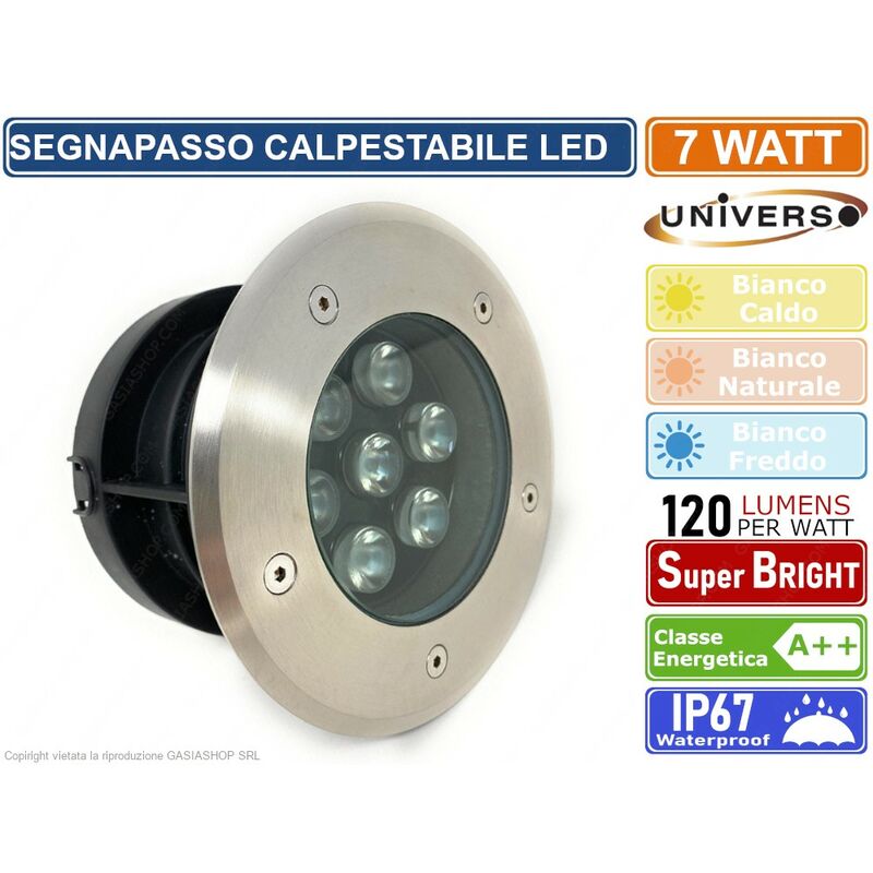 Faretto LED Segnapasso. Installazione a interramento e potenza di 7W. Forma circolare con controcassa in plastica nera, corona in acciaio effetto spazzolato e vetro trasparente. POWER LED SMD con fascio luminoso di 30° e flusso luminoso di 850 lm. Connessione molto semplice grazie al driver integrato e tramite i cavi a saldare. Ideale per l'illuminazione di piante e cortili e, grazie al grado di protezione IP67, è adatto a resistere per molto tempo interrato ed esposto alle intemperie. Disponibile con due differenti temperature di colore: Luce Bianca Calda 3000K, Luce Bianca naturale 4000K e Luce Bianca Fredda 6500K . Dimensioni: Ø 146 x 92 mm. Foro Incasso: Ø 128mm