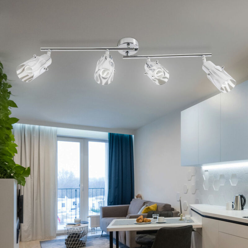 Descrizione Plafoniera molto elegante in cromo Questa lampada da soffitto è altamente raccomandata a tutti coloro che vogliono ravvivare le proprie quattro pareti con un tocco in più. L'aspetto classico di una plafoniera viene qui esaltato dall'eleganza del cromo, rendendo la lampada un vero e proprio eye-catcher in ogni stanza. Per illuminare in modo ottimale ogni stanza, al centro dell'asta di supporto è presente un arco snodabile, che rende il controllo della caduta della luce un gioco da ragazzi. L'illuminazione dei singoli angoli è resa possibile dai faretti regolabili individualmente. Le lampadine non sono incluse. Lampada dettagli • Tipo di lampada: plafoniera • Materiale: cromo • Spot materiali: vetro opalino con cromo • punti in movimento • Lunghezza x altezza in cm: 69 x 12,5 • Prese: 4x E14 • Lampadine incluse: no • Potenza della lampada: massimo 4x 9 watt • Voltaggio: 230 volt