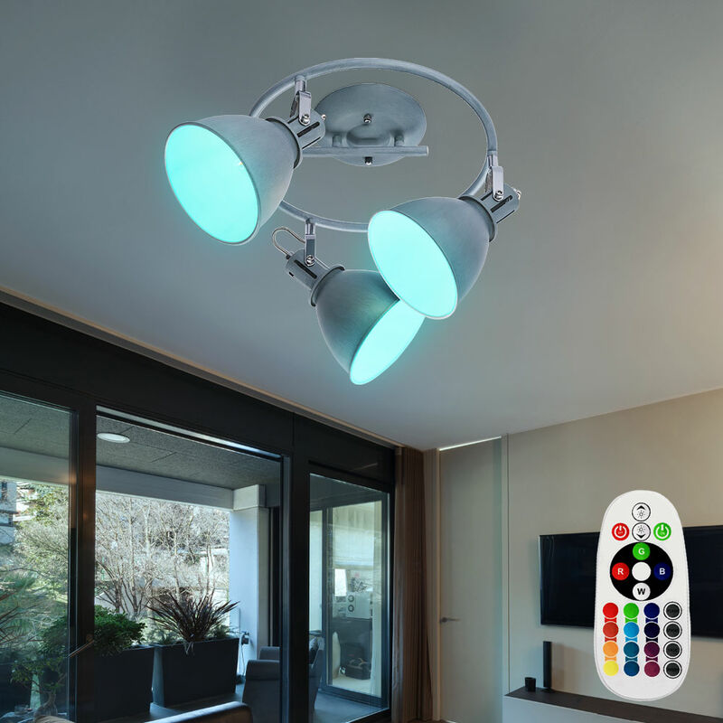 Descrizione Questo faretto da soffitto della serie Jonas unisce tradizione e design. I faretti mobili in metallo grigio, con il colore interno bianco del paralume, sono each dotati di attacco E14 e offrono la possibilità di determinare l'illuminante e quindi l'intensità della luce e la luce colora te stesso (max. 40W). Utilizzando il telecomando in dotazione, l'illuminante LED RGB può essere impostato su diversi colori e garantisce così un'illuminazione d'atmosfera. Tre lampade LED RGB con telecomando per luce bianca e il controllo RGB sono inclusi nella consegna. Dettagli lampada • Tipo di lampada: Faretto da parete • Materiale: Metallo • Colore: Grigio • Spot mobili • Grado di protezione: IP20• Diametro base in cm: 15 • Diametro spot in cm: 14.5 • Diametro x altezza in cm: 33 x 21 • Prese: 3x E14 • Lampadine incluse: Sì • Potenza lampada: 3x 4 watt• Luminosa flusso: 3x 300 lumen• Colore luce: bianco caldo• Telecomando: Solo per la lampadina • Alimentazione: 220-240V, 50-60Hz