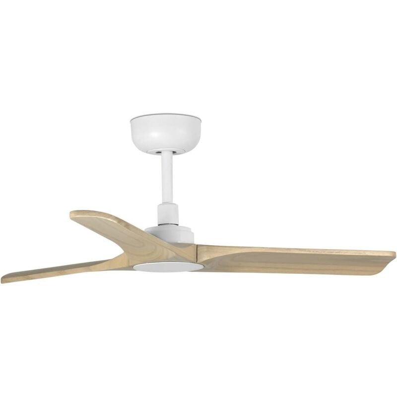 Ventilador de techo blanco sin luz Ø90 cm, modelo HEYWOOD S Ideal para la ventilación de habitaciones de menos de 13m2. Motor fabricado en acero y palas de madera clara. Accionado por mando a distancia, incluido. Dispone de 6 velocidades regulables con un consumo de 5,2-7,3-12,2-17,4-23,2-31,6W y 123-166-204-242-267-300 revoluciones por minuto según velocidad. Este ventilador tiene función inversa, por lo que podrá utilizarlo también en invierno mejorando la eficiencia de su sistema de calefacción. Además, es apto para techo inclinado