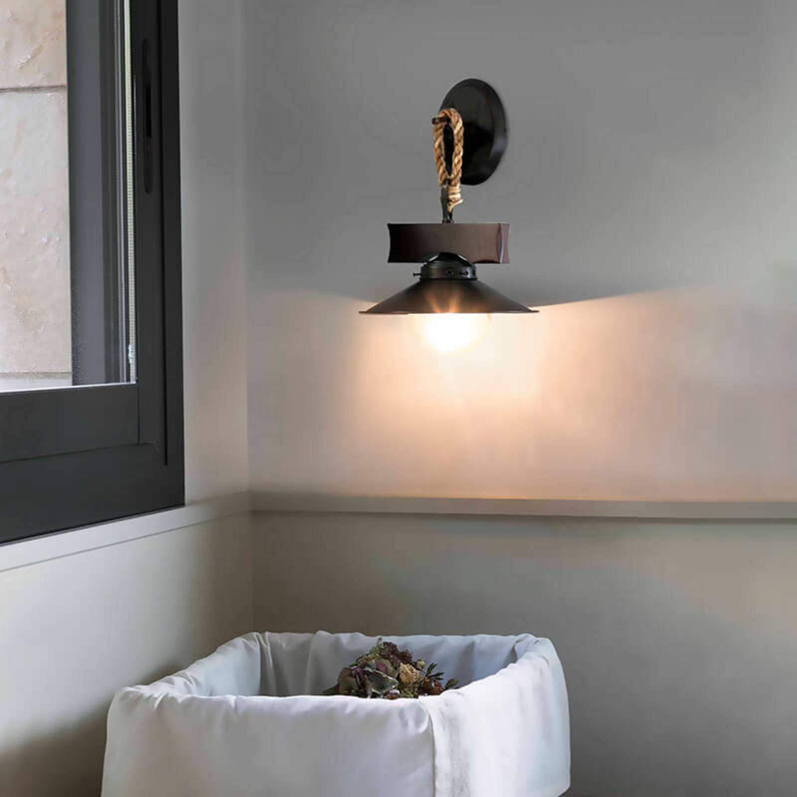Applique rustica Nudos in ferro, legno e vetro L'applique Nudos è un oggetto artistico e di stile. Il suo look decisamente country è dato dai materiali: legno, ferro e vetro. I colori delle finiture armonizzano bene: metallo ossidato, fune ecrù e legno scuro. La sfera di vetro trasparente diffonde la luce in ogni direzione e si intona perfettamente al design rustico di quest'applique. La lampada è adatta a una casa di stile country o anche mediterraneo.
