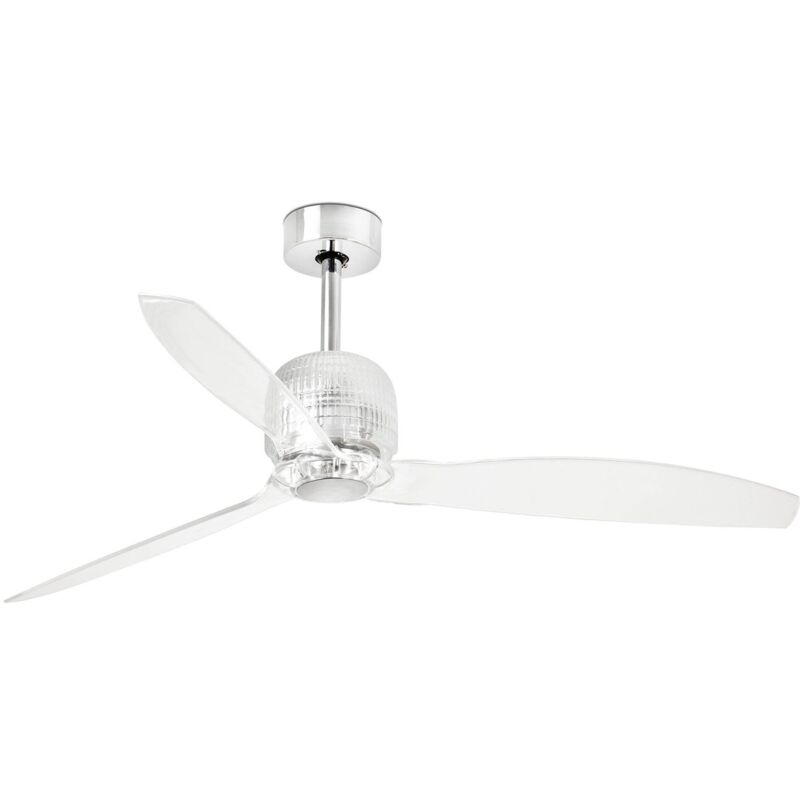 Ventilador de techo modelo DECO FAN de la marca FARO sin luz con accesorio de cristal decorativo. Tiene un motor DC con 6 velocidades: 4-6-9-13-22-32 W / 51-77-103-129-155-185 RPM. Se acciona mediante mando a distancia. El cuerpo es de acero color cromo brillo, cuenta con 3 palas de PC (POL