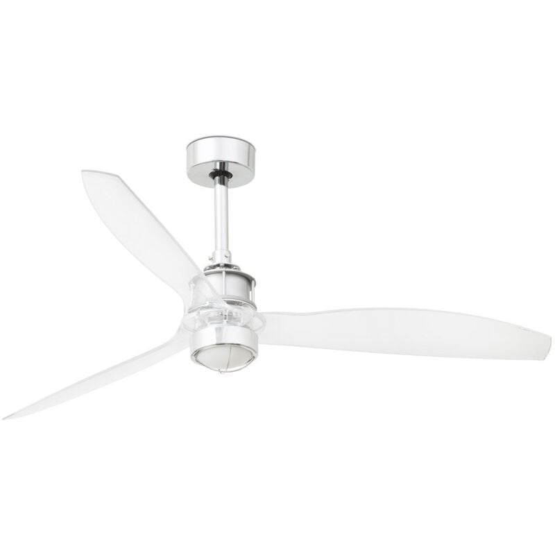 Ventilador de techo modelo JUST FAN de la marca FARO con luz. Tiene un motor DC con 6 velocidades: 4-6-9-13-22-32 W / 51-77-103-129-155-185 RPM. Se acciona mediante mando a distancia. El cuerpo es de acero color cromo brillo, cuenta con 3 palas de PC (POLICARBONATO) de color transparente y tiene un diámetro de 1280 mm.Este ventilador dispone de función inversa, también llamada función verano-invierno, que consiste en el accionamiento del ventilador en sentido inverso para optimizar el uso de la calefacción en invierno. Este ventilador no es apto para exterior.