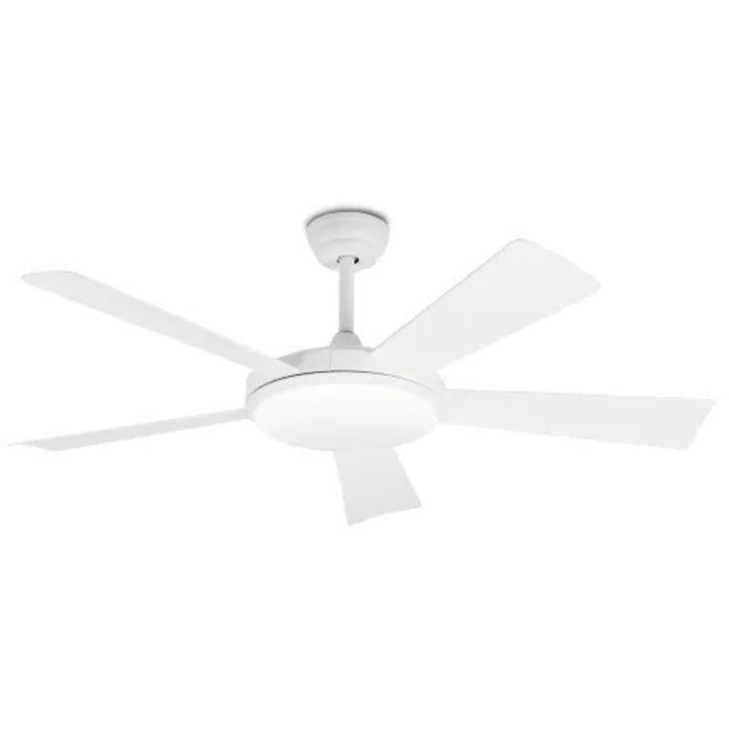 Ventilador de techo modelo SAONA de la marca FARO con luz. Tiene un motor DC con una potencia máxima de 24W y 5 velocidades: 5-8-14-21-38 W / 85-105-126-155-180RPM. Se acciona mediante mando a distancia. . El cuerpo es de acero color blanco mate, cuenta con 5 palas de ABS de color blanco mate y tiene un diámetro de 1320 mm. El difusor es de PC (POLICARBONATO). Este ventilador incluye una fuente de luz SMD LED 2475 Lm. No es compatible con tijas de extensión. Es apto para instalar en un techo inclinado de hasta 30°. Este ventilador no es apto para exterior. Este ventilador dispone de función inversa, también llamada función verano-invierno, que consiste en el accionamiento del ventilador en sentido inverso para optimizar el uso de la calefacción en invierno.