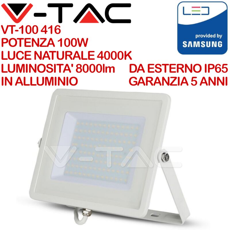 Faro Proiettore LED SMD Con Chip Samsung 100w Bianco IP65 - Luce Naturale 4000k Faro LED V-Tac Pro VT-100 dotato di una potenza di 100W. Corpo ultra sottile in alluminio pressofuso di colore bianco con staffa e cavo di colore bianco e copertura in vetro trasparante. Proiettore con tecnologia LED SMD adatto all'uso esterno, grado di protezione IP65. Fascio luminoso di 100°, flusso luminoso di 8000 lm e rapporto di 80 lm/W. Il design slim, lo rende più leggero di un normale faro e più semplice da installare, oltre ad avere un'estetica più accattivante. Specifiche tecniche: SKU: 416Codice Famiglia: VT-100Marchio: V-TacGaranzia: 5 anniColore della Luce: Luce naturalePotenza: 100WFlusso Luminoso: 8000LMDimmerabile: NoForma: RettangolareGrado di Protezione: IP65Materiale: Alluminio pressofusoCicli ON/OFF: >15000Colore: BiancoCRI: >80Dimensione: 291x30x240mmDurata: 30000 oreEfficienza Luminosa: 80LM/WFascio Luminoso: 100°Grado di Protezione Urti: IK05Fattore di Potenza (PF): >0.9Sensore