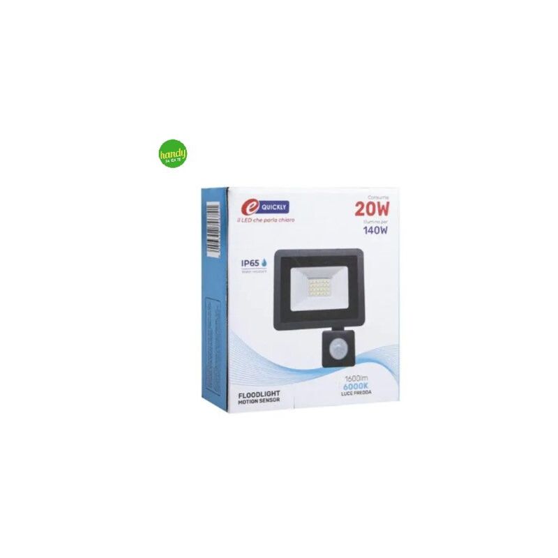 Faretto LED, prodotto dal brand E-Quickly, ultrasottile ed a risparmio energetico. Dotato di sensore di movimento, potenza di 20W luce fredda 6000K, con angolo di fascio ampio 120°, che illumina le aree più ampie con una luce più brillante. Alloggiamento in alluminio pressofuso con vetro temprato, scocca predisposta ad un'eccellente dissipazione del calore e con elevata resistenza ad urti e corrosione di vario tipo grazie ad una lavagna in vetroinfrangibile. Grado di protezione IP65, ciò significa che è resistente all'acqua e polvere grazie ad un anello in silicone sigillato incorporato.