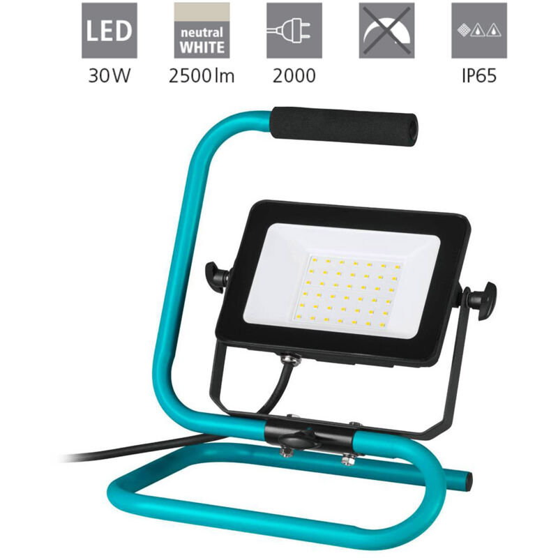 Questo faretto LED portatile del brand Eglo è ideale per uso interno ed esterno (IP65). È realizzato con materiali robusti, ovvero alluminio e plastica nera e turchese, cavi di alta qualità e vetro resistente agli urti. La lampadina integrata emette una luce da 3000K e 2450 lumen, illuminando brillantemente qualsiasi cantiere, stanza o officina.