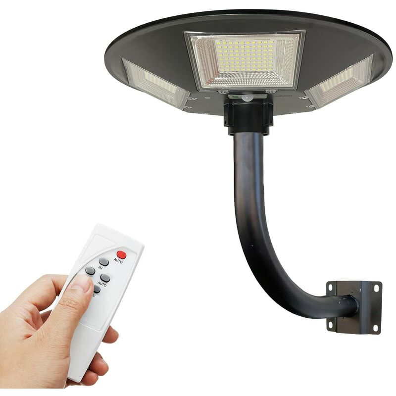 Grazie a questo faro solare potrai illuminare il tuo giardino, garage, vialetto o parcheggio risparmiando sui consumi e riducendo l'inquinamento. Potrai istallarlo su palo curvo da parete incluso nella confezione o adattarlo su un palo centrale: è resistente agli agenti atmosferici e controllabile a distanza con telecomando con cui è possibile regolarne l'intensità della luce. Capace di illuminare fino a 30 ore consecutive con i suoi 400 led di alta qualità, è dotato inoltre di sensore di movimento. Caratteristiche: Faro stradale solare 400 Led Dimensioni: 55 x 13 cm Materiale: ABS Potenza: 300W Area d'illuminazione: fino a 600 m² Durata d'illuminazione: 15-30H Colore della luce: Bianca Protezione: IP66 ( adatto agli esterni ) Capacità della batteria: 3000MA Palo curvo da parete 30 x 34 cm Telecomando ( 2 AAA non incluse ) Timer 3h - 5h - 8h Modalità Automatica Intelligente Regolazione dell'intensità della luce Include: 1x Faro solare 1x Palo curvo 1x Telecomando ( Batterie non