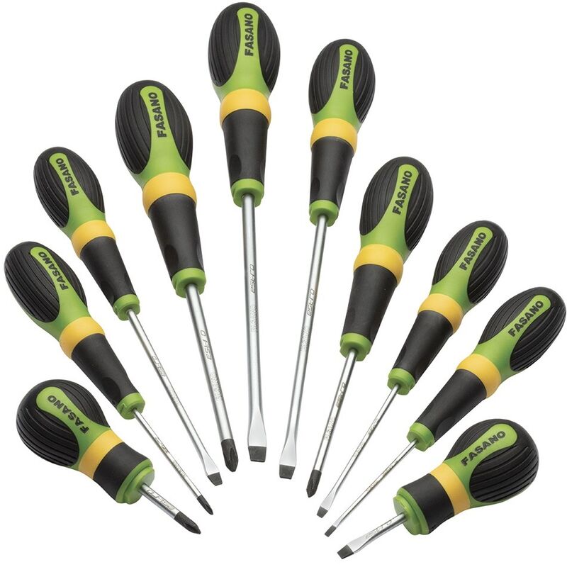 SET DI GIRAVITI MISTI, AD INTAGLIO E A CROCE PHILLIPS - FG 22/S10 Impugnatura bi-materiale Speciali scanalature laterale che consentono un grip perfetto Asta in Cromo-Vanadio, con punta brunita e magnetizzata DIN ISO 2380 - DIN ISO 8764 Forniti in set di cartone Contenuto: 2.5x60, 3x75, 4x100, 5.5x150, 6.5x150, 4x30, PH0x60, PH1x80, PH2x100, PH1x30