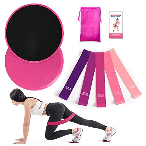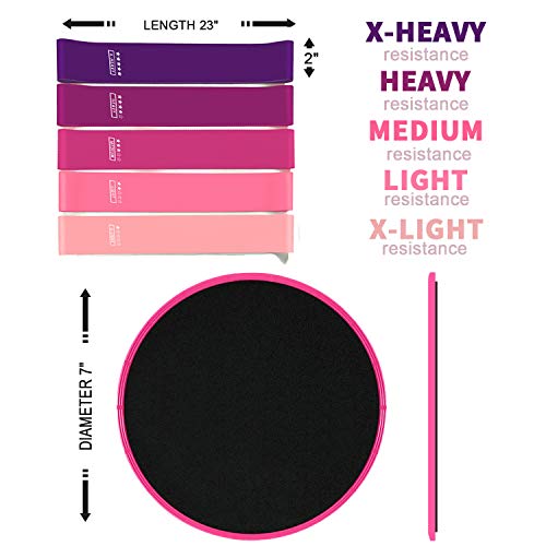 Fasce elastiche di resistenza da donna e 2 Core Sliders con sacca, set di 5 fasce rosa per esercizi fitness per gambe e glutei, allenamento a casa, bande elastiche per pilates