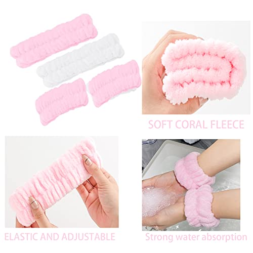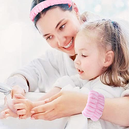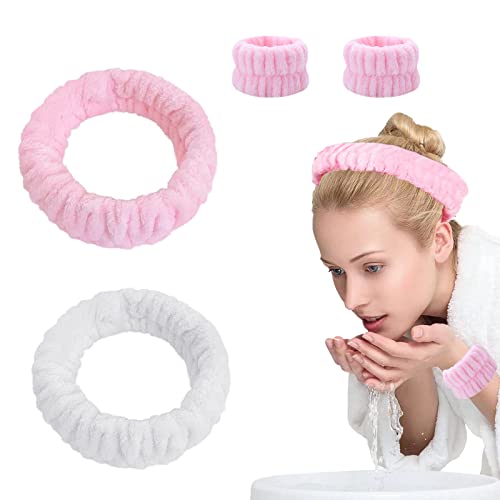 Numero di pacchetti: Riceverai 2 trucco fascia per capelli 1 bianco e 1 rosa, 2 bracciali detergenti viso rosa con polsini elastici per lavare il viso.