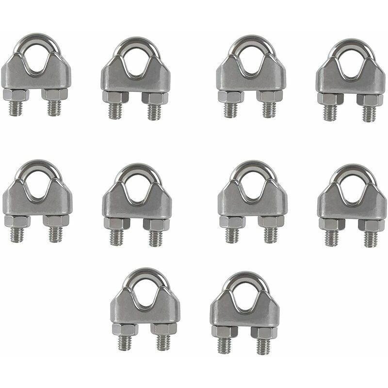 Materiale: morsetti per cavi a giogo in acciaio inossidabile 304 per la massima resistenza alla corrosione, resistenza all'umidità e durata. Dimensioni: Quantità: 10 pezzi Peso: 248 g Offriamo diverse dimensioni per soddisfare esigenze diverse. Si prega di fare riferimento all'immagine per informazioni dettagliate sulla dimensione. Si prega di fare riferimento all'immagine per scegliere la taglia adatta. Caratteristica: fascetta fermacavo in acciaio inossidabile 308 composta da bullone a U, sella forgiata e due dadi. I due strati di cavo vengono inseriti nel bullone a U e fissati per un collegamento a tenuta stagna. I fili antiscivolo al centro della sella aumentano efficacemente l'attrito. Le filettature interne a forma di U antiscivolo aumentano efficacemente l'attrito. Forgiato in acciaio inossidabile di alta qualità, alta corsa, alta sicurezza. Applicazione: le fascette per cavi sono facili da installare, smontare e riutilizzare. Sono comunemente usati per appendere tende da sole