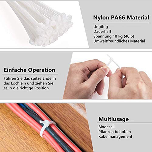 ULTRA DUREVOLE: le fascette per cavi bianche sono realizzate in nylon PA66, che si comporta bene in qualsiasi condizione atmosferica. Può resistere a -10 ℃ -80 ℃ (14 ° F-176 ° F). Pesante, antietà, tenacia. Lunga aspettativa di vita.