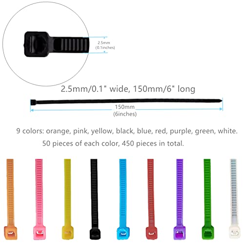 Fascette colorate in nylon, 150 x 2,5 mm, 9 colori totali 450 pezzi, 50 pezzi ciascuno per arancione, rosa, giallo, nero, blu, rosso, viola, verde e bianco.
