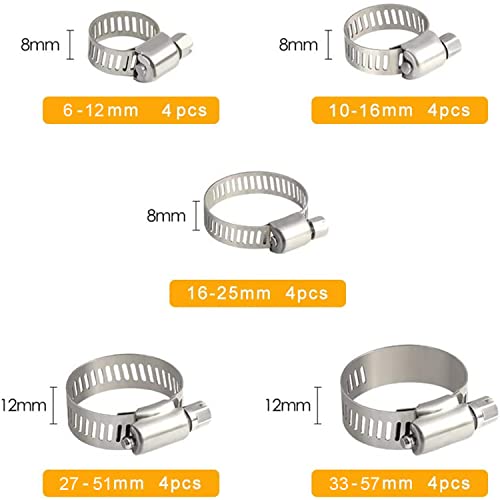 Contenuto della confezione:: il kit di morsetti per tubo viene fornito con un totale di 20 morsetti domestici per PC con un intervallo di 5 dimensioni, quantità sufficiente per soddisfare le vostre diverse esigenze e sostituzione nella vita quotidiana per la vostra vita, garage, il prato e il giardino, ecc.