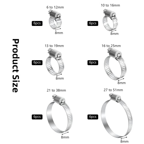 Dimensioni multiple: 36 pezzi di 6 misure di fascette stringitubo sono disponibili per soddisfare le vostre diverse esigenze. - Modelli: 6-12 mm, 10-16 mm, 13-19 mm, 16-25 mm, 21-38 mm, 27-51 mm. Tutte le fascette hanno una larghezza di 8 mm