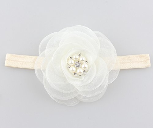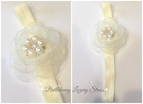 FASCIA ELASTICA BABY CAPELLI CON FIORE ORGANZA PERLE CRISTALLI STRASS BATTESIMO REGALO COMPLEANNO CERIMONIA Hairband Brillabenny