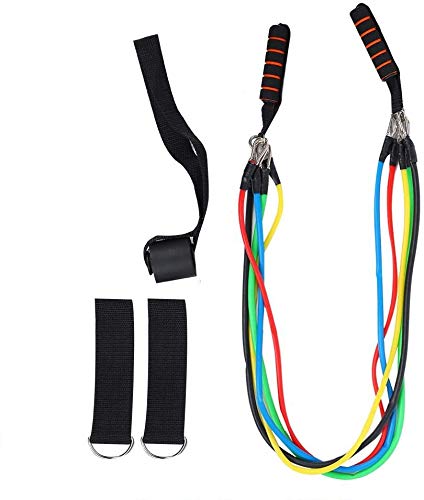 KIT DI FASCE DI RESISTENZA DA 11 PZ: 5 tubi di tensione con diversi livelli di resistenza + 2 maniglie in schiuma antiscivolo + 2 cinghie per i piedi + 1 fibbia per porta di sicurezza + 1 custodia. Allena la tua massima forza, costruisci muscoli, allunga i muscoli, aumenta la flessibilità e tonifica il tuo corpo.
