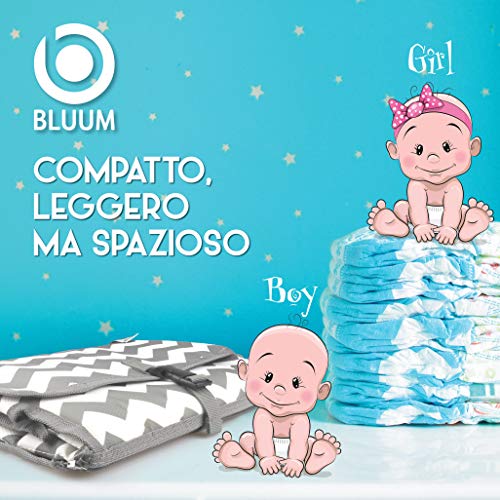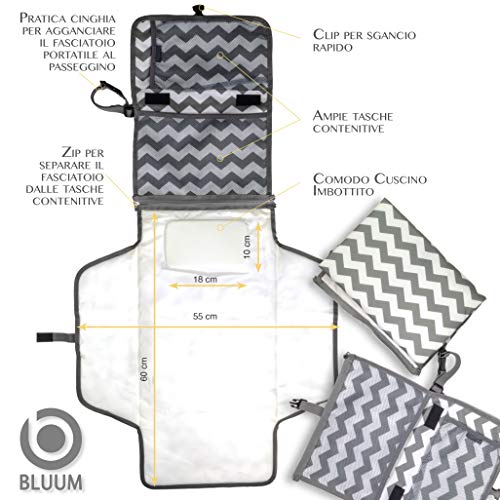 ❤️ CONFORTEVOLE E SICURO PRATICO - il fasciatoio portatile di Bluum è ben imbottito e confortevole potrai cambiare il tuo bambino comodamente in grande stile. Impermeabile e facile da pulire. Il cuscinetto imbottito protegge la testa del bambino. Il materassino fasciatoio separabile pieghevole è lungo 64 cm e largo 55 cm. Si pulisce facilmente con una delle salviette neonato è protegge il tuo bambino da superfici sporche e germi