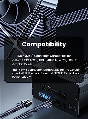 Compatibile solo con Corsair / Great Wall / Thermal-take / NZXT alimentatore Fasgear PCIE 5.0 cavo di alimentazione è compatibile solo con Corsair / Great Wall / Thermal Take / NZXT con porte a 8 pin (4 + 4). Un cavo di alimentazione GPU da 16 pin a 2 x 8 pin (4 + 4) trasmette l'alimentazione comodamente da alimentatore a GPU. Si prega di notare che questo cavo solo per Corsair / Great Wall / Thermal Take / NZXT alimentatore e GeForce RTX 4070ti / 4070 / 4060 ti / 4060 / 4050ti / 4050