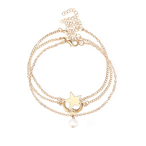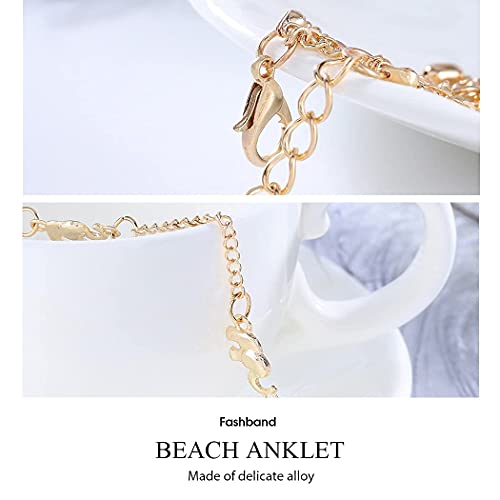 Fashband Boho - Cavigliera con perle dorate, con stella, luna, spiaggia, regolabile, per donne e ragazze