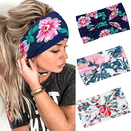 Fashband Fasce larghe per capelli Boho con fiore blu, stile vintage, con nodo elastico, per corsa, yoga, turbante, accessori per capelli per donne e ragazze (confezione da 3)