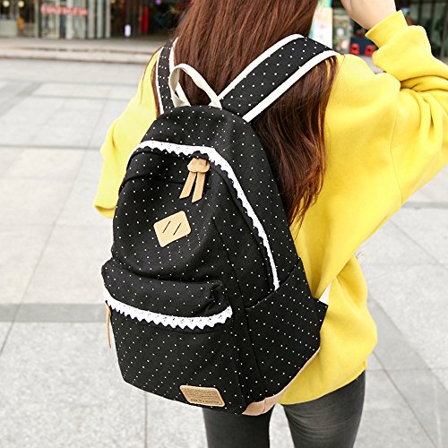 5 All Fashion Girl zaino per la scuola zaino Canvas Donna Adolescente cotone Borsa per la scuola Outdoor tempo libero con elegante pizzo QXT 6066, nero (nero) - QXT-6066