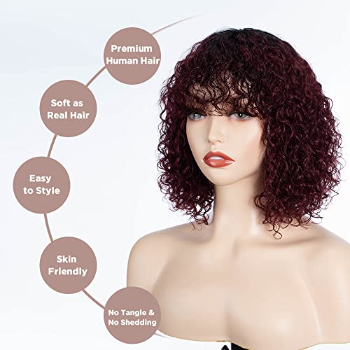 FASHION IDOL Bob Curly, parrucche di capelli veri con frangia Jerry Curl Bob, capelli umani vergini brasiliani, senza merletto, per donne (25 cm, bordeaux)