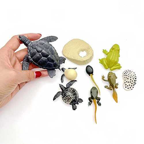 JZK 2 Set fasi ciclo di vita figure di una rana e tartaruga marina, ciclo di vita rana, modelli ciclo vita tartaruga marina giocattoli ciclo di vita animali, educativi precoci, ciclo di vita girino