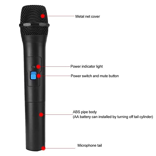 Plug and Play e Lunga durata d'uso: microfono wireless universale VHF in mano, discorso karaoke, plug and play, gamma di frequenze più ampia, meno interferenze, visualizzazione facilmente perfetta della tua voce. Il microfono wireless è facile da usare, non è necessario installare altri software applicativi. Il microfono radio è alimentato da 2 batterie AA e normalmente può essere utilizzato per 10 ore (non incluso nella confezione)