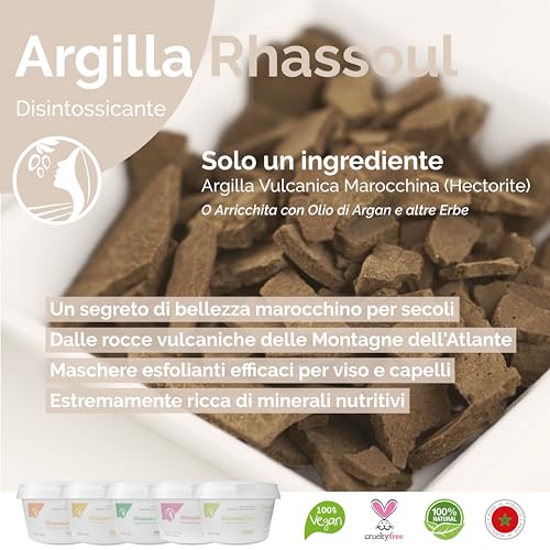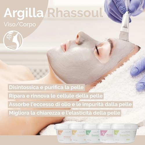 MASCHERA VISO RIGENERANTE: Mescolate l'argilla con acqua o acqua di rose per creare una maschera facciale che purifica profondamente. Applicate evitando occhi e labbra, lasciate agire per 10-15 minuti e sciacquate, poi idratate con olio di Argan o di semi di fico d'India per un effetto nutritivo.
