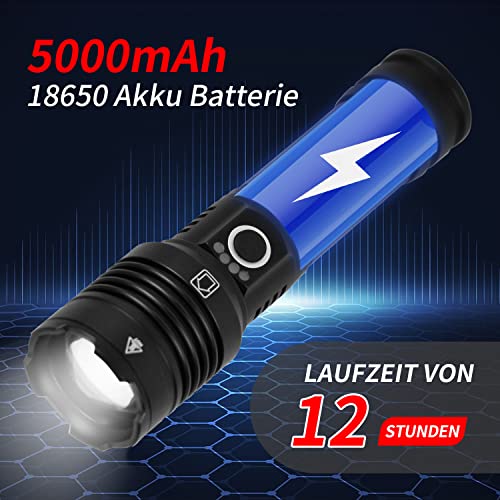 【BATTERIA POTENTE 26650 & RICARICA USB 】 : La torce led alta potenza adotta una nuova batteria 26650 ricaricabile da 5000 mAh, che è veramente ad alta potenza e può durare per 12 ore. Rispetto ad altre batterie da 5000 mAh, la sua energia di scarica è del 50% superiore.Le torcia led 10000 lumen possono essere ricaricate tramite il cavo USB, che consente di caricare la torcia in modo più conveniente.