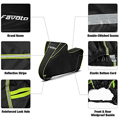 Materiale Oxford 300D & Cuciture fisse: il coprimoto Favoto è realizzato in materiale Oxford 300D e protegge la tua moto da pioggia, UV, polvere, graffi, ecc. Le doppie cuciture con strisce impermeabili e rivestimento in PU all'interno garantiscono migliori prestazioni della copertura in tutte le condizioni atmosferiche.