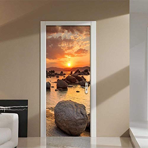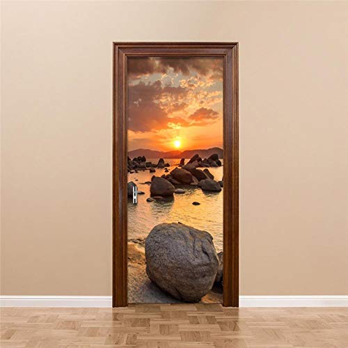 FCFLXJ Porta murale PVC Adesivo per porte Autoadesivo Sunrise rock beach vinile HD stampa Applique Porta a muro decorazione famiglia camera da letto Soggiorno la porta decorazione impermea 95X215CM