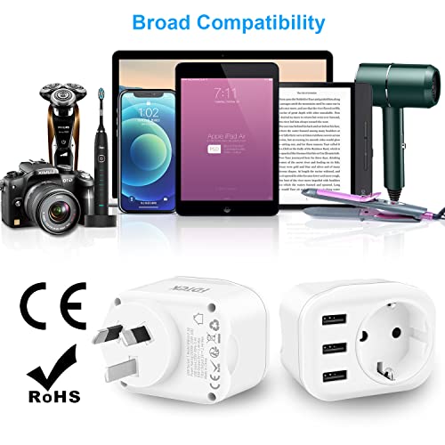 Adattatore da Viaggio 4 in 1: Questo adattatore australia con 1 presa AC (Europa 2 pin) e 3 USB per caricare 4 dispositivi contemporaneamente ad alta velocità. 2.4A USB è compatibile per smartphone.