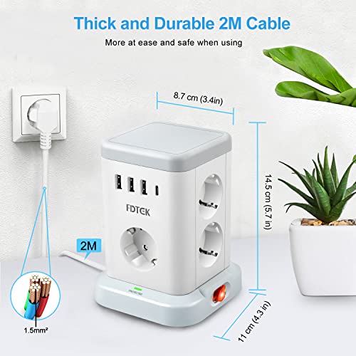 FDTEK Ciabatta Elettrica, Torretta Multipresa con 7 Prese e 3 Porte USB-A & 1 Tipo C, Ciabatta Cubo con Protezione da Sovraccarico e Interruttore, Cavo da 2m, Adatto per Casa e Ufficio, 3680W/16A
