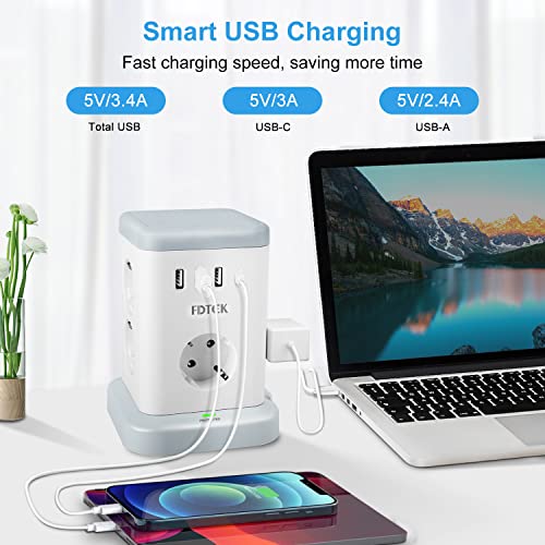 11 in 1 Multipresa con USB - Ha 7 prese in direzioni diverse, 3 USB A e 1 porta Type C. Può caricare 11 dispositivi elettronici contemporaneamente. La potenza massima è di 3680W e la corrente massima è di 16A. Le 4 porte USB sono un IC intelligente integrato con una corrente totale di 3.4A. Può rilevare automaticamente il dispositivo e fornire corrente. Ci sono 4 pastiglie antiscivolo nella parte inferiore della torretta multipresa, in modo che la presa può essere posizionata in modo sicuro.