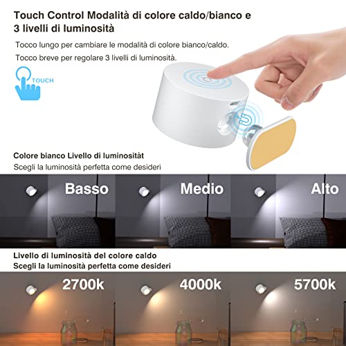 Feallive Lampada da parete a LED Moderna, Applique da parete Controllo touch Bianco/Modalità di luminosità calda Batteria ricaricabile Faretti da parete Ruotare di 360° magnetica Lampada da comodino
