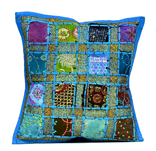Federa per cuscino da divano, con motivo patchwork, ricami in stile etnico e paillettes Tradizionale Blue