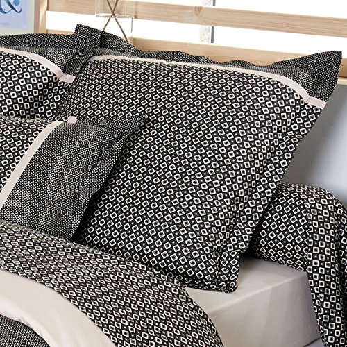 Copripiumino 65 x 65 cm in percalle di puro cotone pettinato 78 fili/cm², modello reversibile, atmosfera Urban Chic con piccoli motivi geometrici a rombi e rotondi nei toni del nero e beige chiaro.