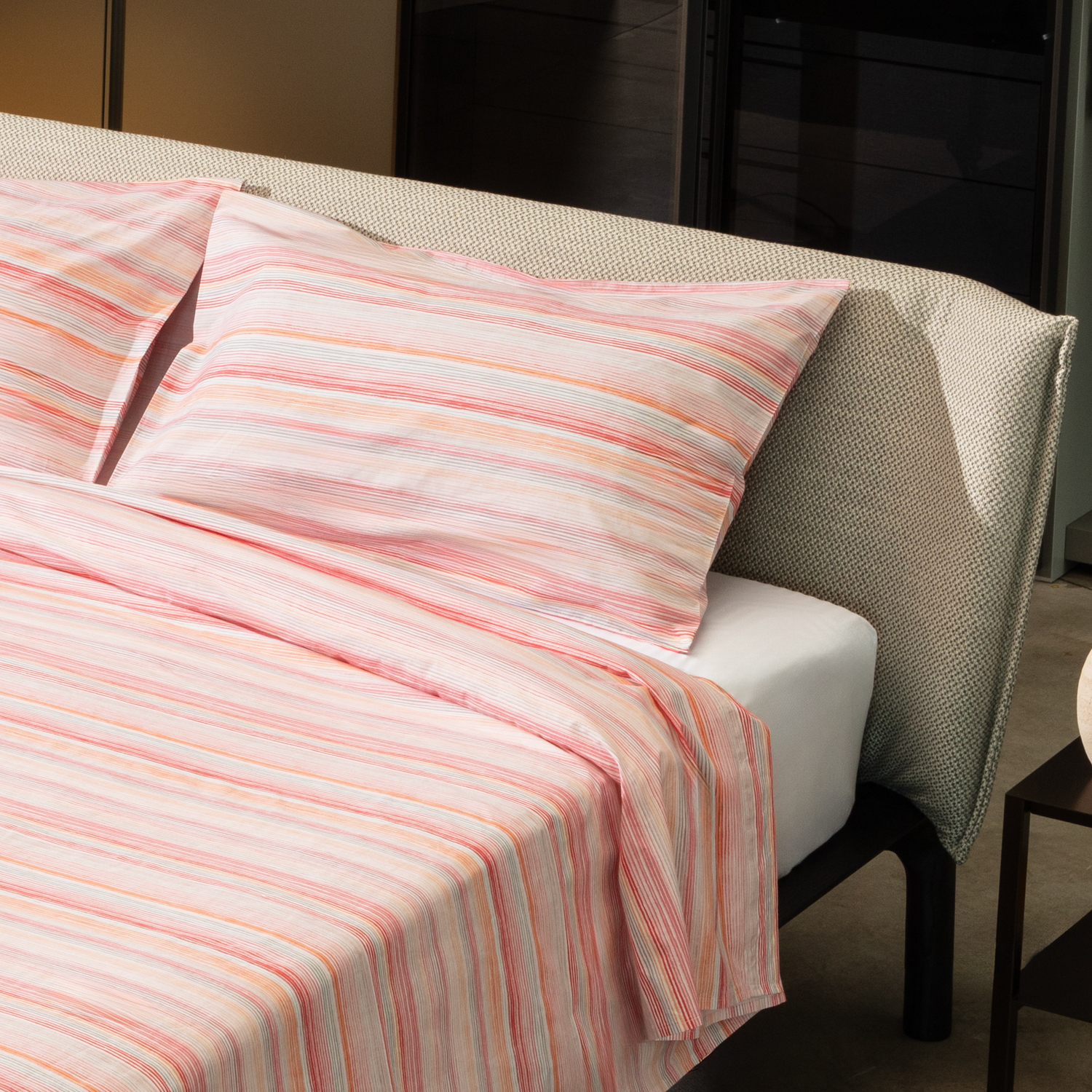 La federa in cotone percalle è la scelta di qualità per rivestire il tuo cuscino con freschezza e morbidezza. La delicata stampa digitale con righe rosa e arancioni aggiunge dettagli semplici ed essenziali in qualsiasi camera da letto. Crea il tuo set tessile letto personalizzato abbinando la federa al lenzuolo piano e con angoli coordinati in cotone percalle. La federa è lavabile in lavatrice a 40° e ha misura 50x80 cm.