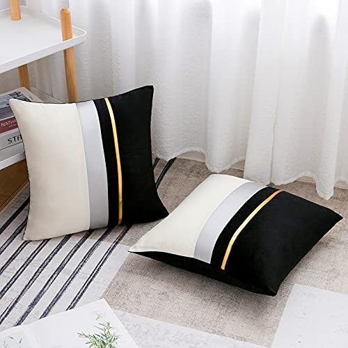 Set di 2 Federe Cuscini Divano 45 x 45cm Velluto Copricuscini Decorativi Moderne con Pelle Righe Dorate Copricuscino Quadrate Lusso Letto Auto Soggiorno Sedia Nero