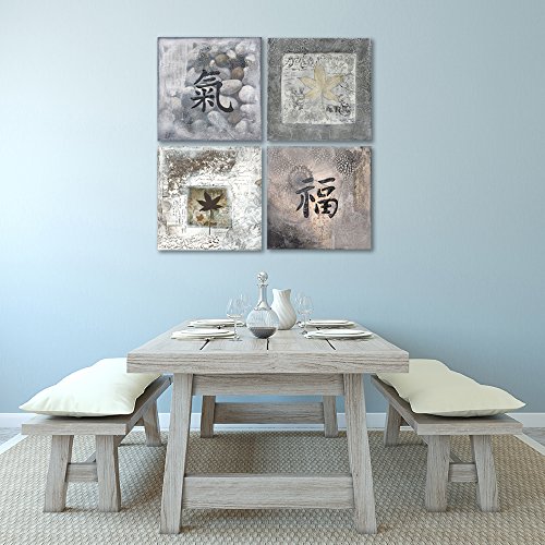 Feeby Frames, Quadro multipannello di 4 Pannelli, Quadro su Tela, Stampa Artistica, Canvas, 60x60 cm, Carattere Cinese, Pietre, Foglie, Zen, Grigio