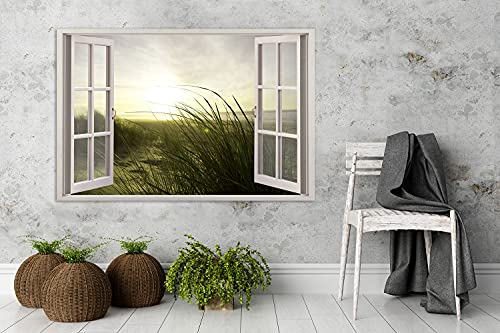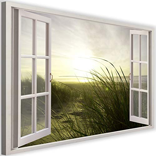 Feeby Quadro Tela Non Tessuta Vista Dalla Finestra Illusione 3D 90x60 cm Decorazione murale Immagini Moderni Soggiorno Tramonto Sul Mare Spiaggia Erba verde